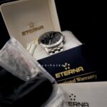 Modern chronographs watch from Eterna with luminous baton index, dual sub dial and Arabic date indicator.